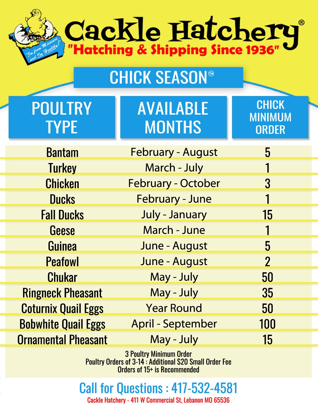 PLEASE NOTE: Availability chart is updated every 60 seconds and might not represent a guaranteed reserved shipping date or pick up date. The chart changes often and unavailable breeds turn available as egg numbers become more accurate. So, check the chart often for buying opportunities. This chart is not used for what might be available for walk in-store purchases that were not booked and reserved.