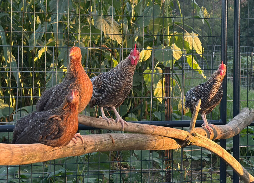 Last May I ordered 15 straight run Crele Old English Game Bantams. I received 17 happy, healthy chicks and raised every single one. They thrived from day one and were a total pleasure–friendly and active from the start. My only problem is the fact that of the 17, 14 were roosters! I realize I ordered straight run, but this is pretty much an autosexing breed. I guess someone ordered pullets the same week and I got the leftover roosters. Fortunately, I was able to place all the extra roosters and I now have a beautiful rooster and three little hens.