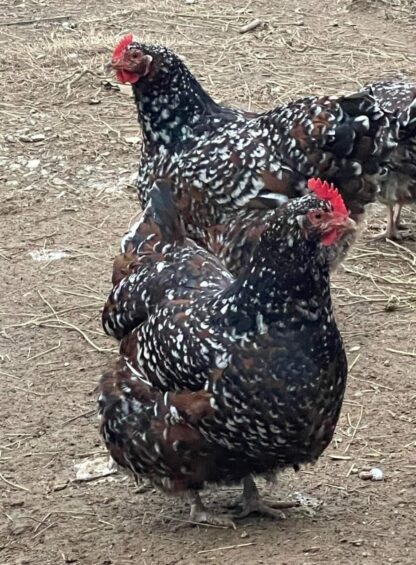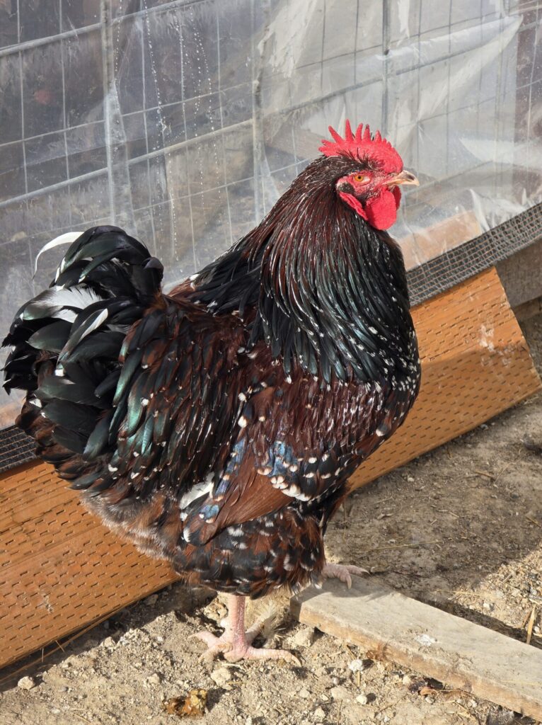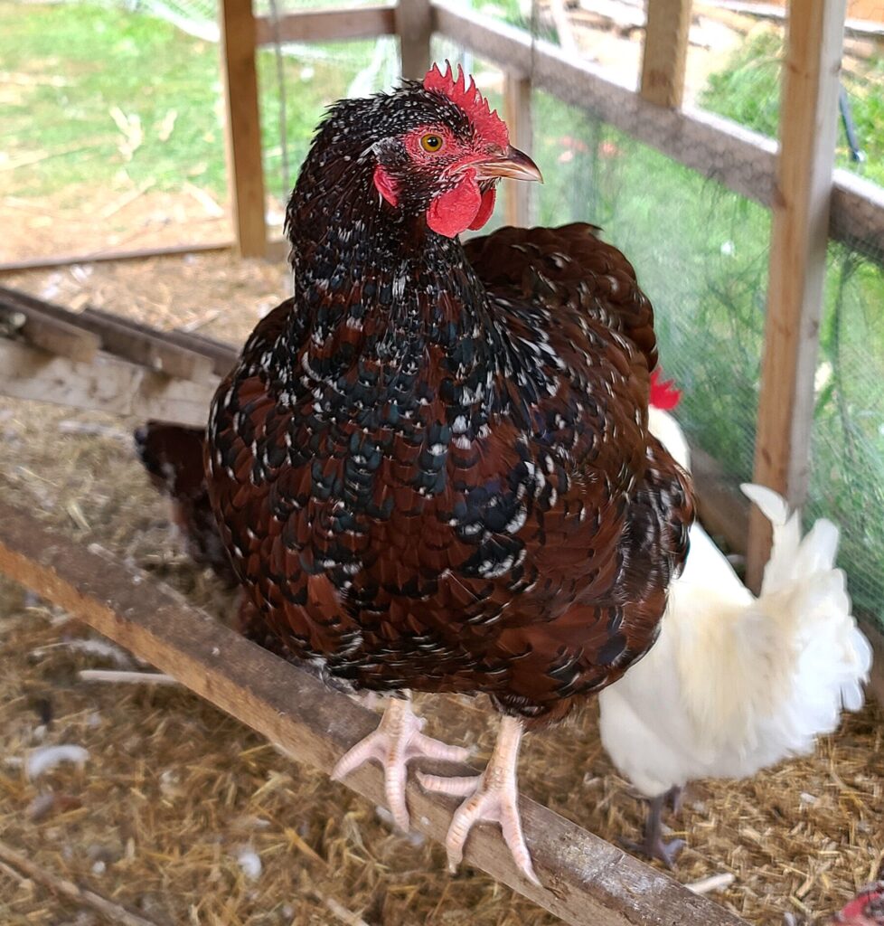 The Jubilee Orpington Chicken was introduced by William Cook’s family in 1897. It was created to commemorate the Diamond Jubilee of Queen Victoria. It was believed that they were a cross between a Spangled Old English Game, Dorkings, and Buff Orpingtons, though some believe that the Speckled Sussex could have had a strong influence on it. Their feather color pattern is very complex and can take up to 18 months to finish. They have a mahogany ground color with black spangles with white tips at the end. Their beak, legs, and feet are white. Earlobes, face, comb, and wattles are red and their eyes also. These chickens are great for their size and temperament. They are a decent brown egg layer and cold hearty. A great addition to your flock.