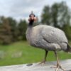 Typical guinea fowl but feathers are a beautiful purple grey. Males get bright blue heads!