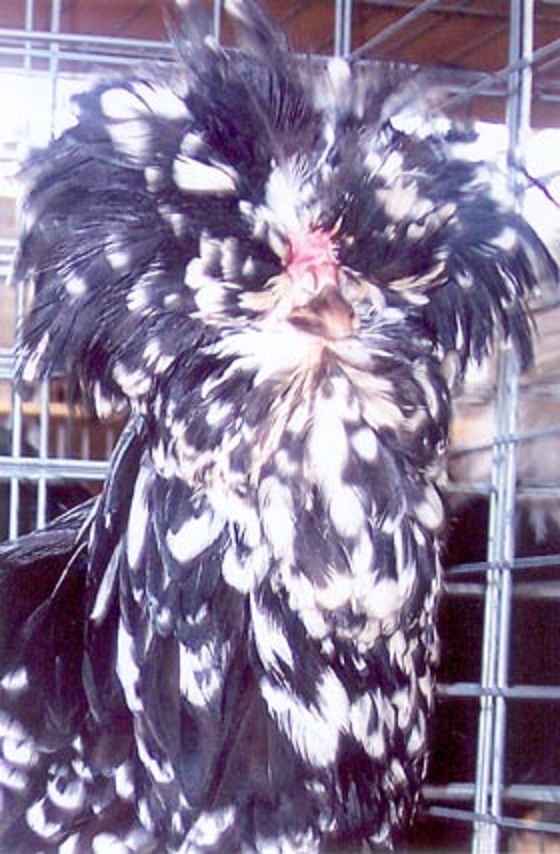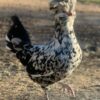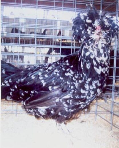 The Mottled Houdan chicken breed was imported from the town Houdan (France) into England around the 1850’s. The Mottled Houdan chicken was introduced to America in 1865 and later in 1874 it was admitted into the American Standard of Perfection. This unique chicken breed has a fifth toe, is an old French breed, has a wide cavernous nostril, a large crested feather head and is a white egg layer. The females are extremely docile and gentle and make good pets. Not particularly a good free range chicken if you have predators because of their top knot that blocks some of their vision. They are known as the “French Hen” and make a great backyard chicken for pets and show.