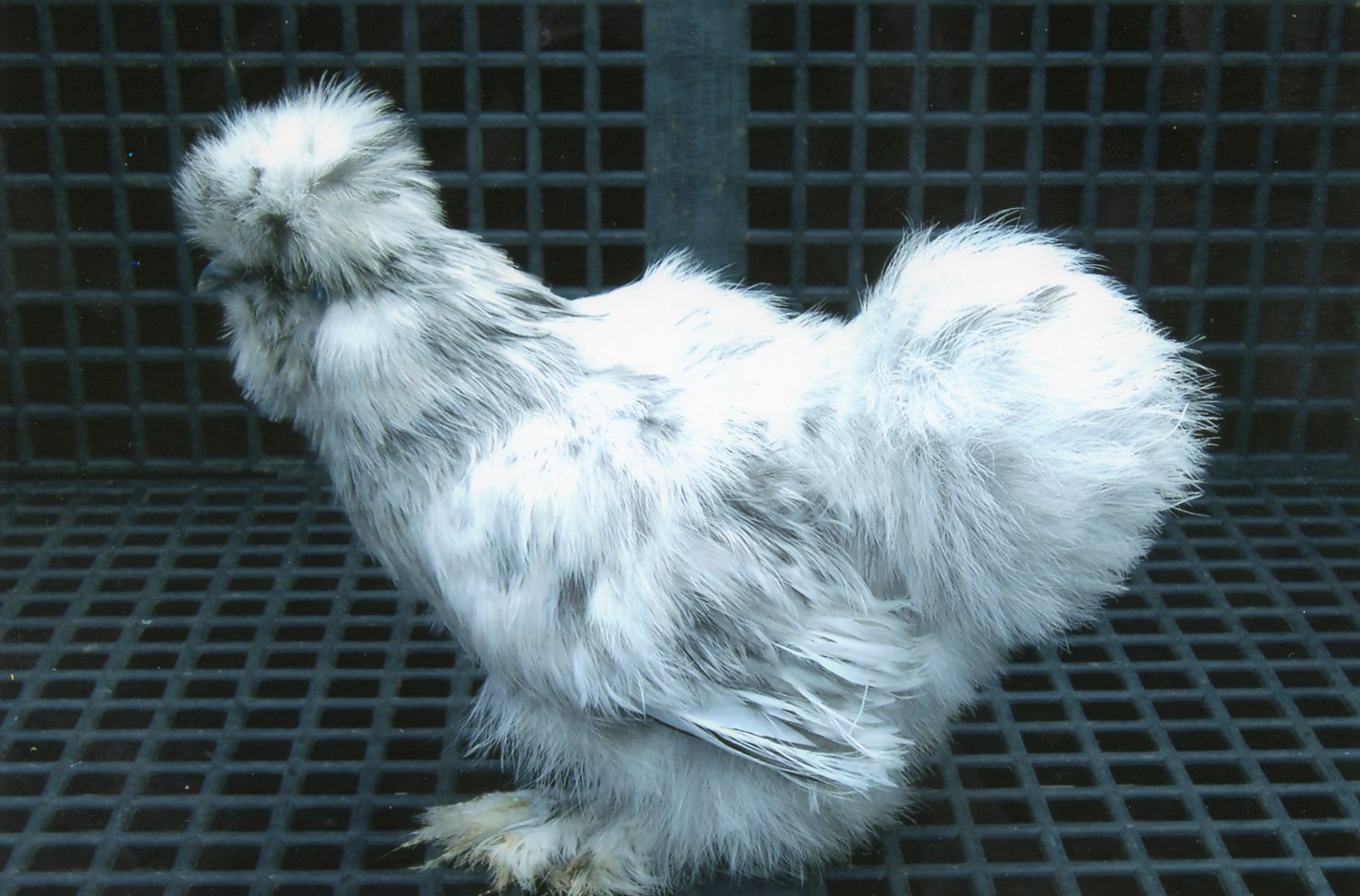 Splash bearded Silkie bantam chickens have lovely white or pale blue plumage with irregular patches of black or dark blue color. Splash is the most recent Silkie variety in the APA Standard, admitted in the year 2000.