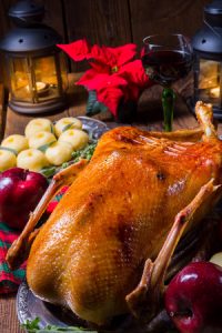 Whether the goose has been stuffed or not, prick the skin (but don’t stab into the meat) all over with the tines of a meat fork so the fat will ooze out as it liquifies — sort of a self-basting process. For extra crisp and tasty skin, rub it all over with a cut lemon, sprinkle with salt and dust with a little flour.